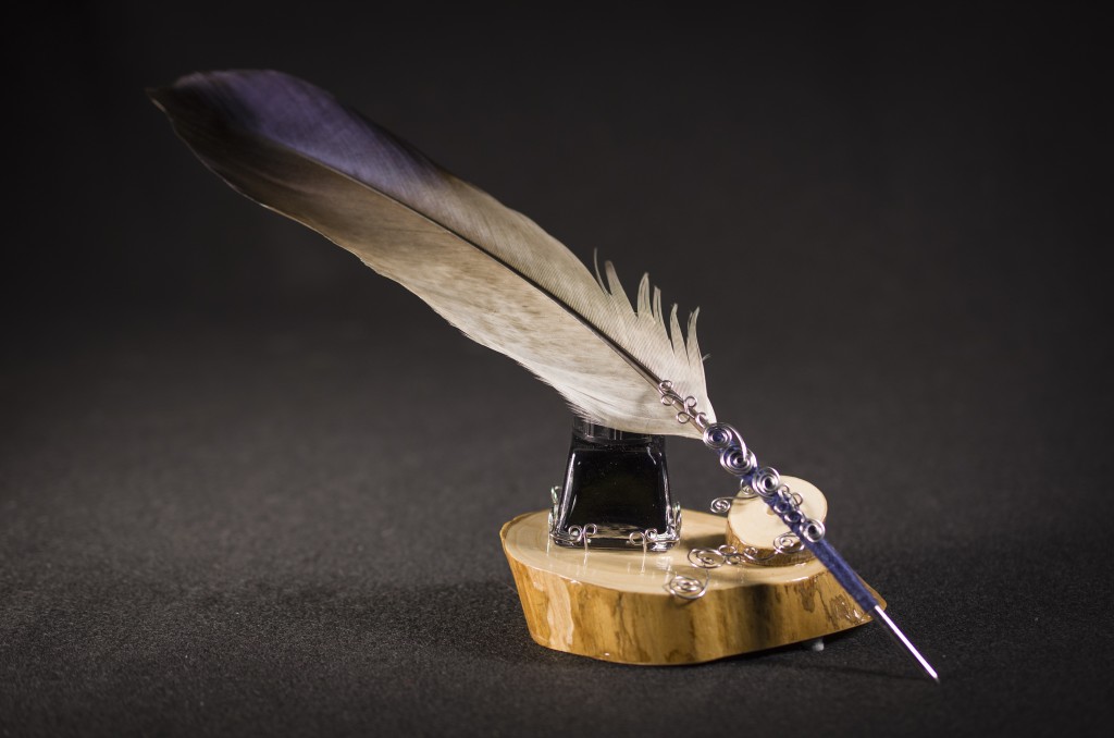 La plume à tremper possède une pointe de métal #108 et  son encrier (encre de chine).