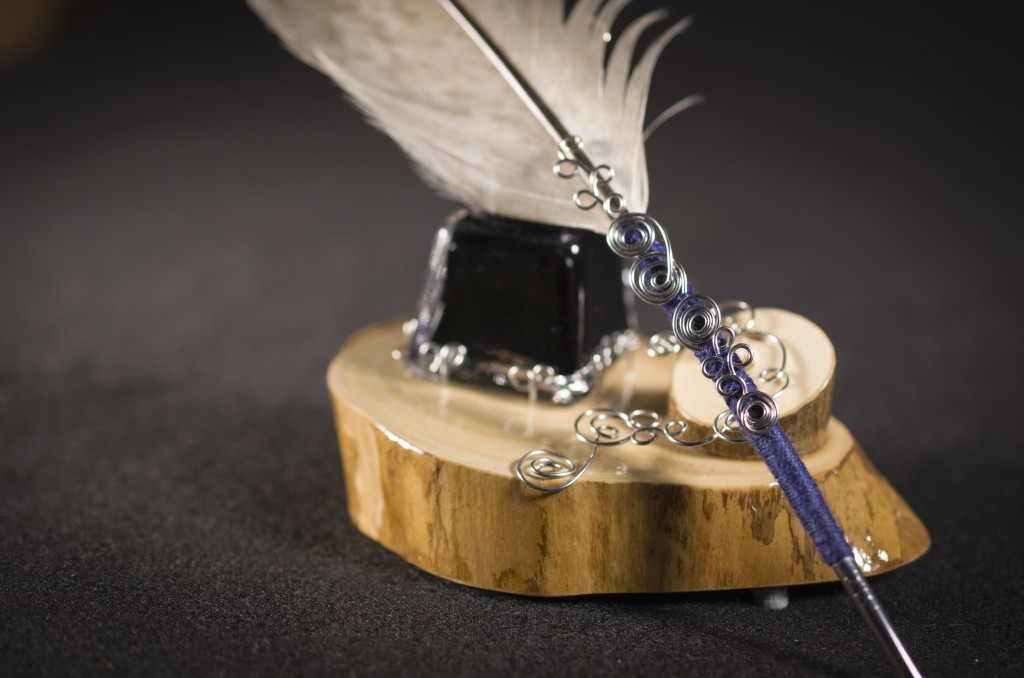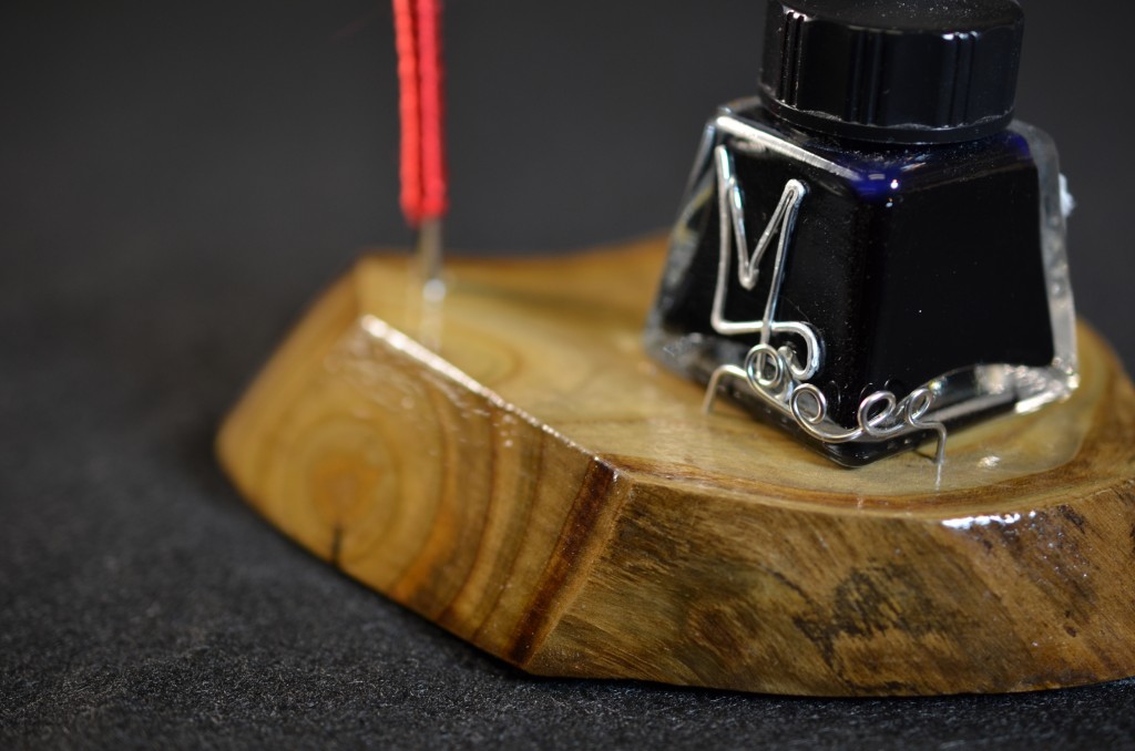 La plume à tremper possède une pointe de métal #108 et  son encrier (encre de chine).